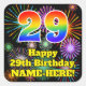 This fun and joyful birthday square sticker design features a large number “29” having a colorful rainbow spectrum gradient inspired pattern. It also features the message “Happy 29th Birthday,”, and a customizable name. The background features a vibrant and colorful pattern inspired by the look of bursting celebratory fireworks. Colorful, fun, personalized stickers like this might be given as a birthday gift, or used while wrapping presents, or perhaps used as birthday party decorations when celebrating somebody’s 29th birthday. [~Z0000579]