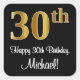 Este sofisticado, elegante y lujoso diseño de pegatina cuadrado de cumpleaños presenta un gran número ordinal "30" con un aspecto de imitación/faux de oro, además del mensaje de bienvenida de cumpleaños "Feliz cumpleaños número 30", y un nombre personalizado con un tipo de letra estilo script. El fondo es negro de color. Pegatinas elegantes que podrían ser usados al envolver un regalo o regalo en honor a los 30 años de alguien, o tal vez podrían ser entregados a los invitados en una celebración de cumpleaños o fiesta. [~Z0000517]