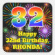This cheerful and fun birthday square sticker design features a large number “32” with a colorful rainbow spectrum gradient inspired pattern, along with the message “Happy 32nd Birthday,”, and a customizable name. The background features a colorful pattern inspired by the appearance of bursting celebratory fireworks. Fun, colorful, personalized stickers like this might be given as a birthday present, or used while wrapping gifts, or perhaps used as birthday party decorations when celebrating somebody’s 32nd birthday. [~Z0000579]