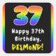 Este audaz y divertido diseño de pegatina cuadrado con temática de cumpleaños presenta un gran número de "37" con un patrón de gradiente inspirado en el espectro de colores del arcoiris, junto con el mensaje "Feliz cumpleaños número 37", y un nombre de destinatario del personalizable. Vibrantes pegatinas con temas de cumpleaños como estos podrían ser usados o entregados en una fiesta de cumpleaños para celebrar el cumpleaños 37 de alguien, o quizás usados al preparar invitaciones o regalos para un evento de ese tipo. [~Z0000630]