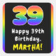 Este alegre y divertido diseño de pegatina cuadrado con temática de cumpleaños presenta un gran número de "39" con un colorido patrón de gradiente inspirado en el espectro de arcoiris, junto con el mensaje "Feliz cumpleaños número 39", y un nombre de destinatario personalizado. Pegatinas con temas relacionados con el cumpleaños que atraen la vista como estos pueden ser entregados o usados en una fiesta de cumpleaños que celebra el cumpleaños 39 de alguien, o tal vez usados al preparar regalos o invitaciones para un evento de este tipo. [~Z0000630]