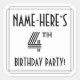 Este elegante y inspirado diseño pegatina cuadrado de los años 2000 inspirado en la fiesta de cuarto cumpleaños incluye un nombre de personalizable, un intrincado estilo Art Déco inspirado en el número "4th", el mensaje "¡BIRTHDAY PARTY!" y un patrón fronterizo compuesto de líneas. Pegatinas como estos podrían ser entregados o usados en una fiesta de cumpleaños realizada para alguien que está celebrando su cuarto cumpleaños, o tal vez usados al envolver regalos o preparar invitaciones para tal evento. [~Z0000618]