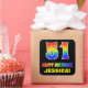 Este alegre, divertido y colorido diseño de pegatinas con temática de cumpleaños presenta un gran número "51" y el mensaje "FELIZ CUMPLEAÑOS", ambos con un coloreado de patrones inspirado en el gradiente del espectro del arcoiris, junto con un nombre personalizado amarillo en negrita. El fondo es negro de color. Pegatinas con temas de cumpleaños divertidos como este podrían ser usados al envolver un regalo o regalar un regalo a alguien que esté celebrando su primer cumpleaños, o tal vez se les pueda dar a los asistentes en una celebración de cumpleaños o fiesta. [~Z0000480]