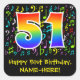 Este divertido, vibrante y colorido diseño pegatina de cumpleaños presenta un gran número "51" con un diseño inspirado en el gradiente del espectro arcoiris. También incluye el mensaje "Feliz cumpleaños número 51", y un nombre personalizado. Parte del fondo tiene un patrón de símbolos y notas musicales coloridas. Pegatinas con temática de cumpleaños como este pueden ser divertidos de usar como decoración de fiesta de cumpleaños, o tal vez dar como regalo de cumpleaños, o tal vez ser usados al envolver regalos de cumpleaños que se dan en celebración de un compositor de canciones, de un músico, de un cantante, o del cincuenta cumpleaños de alguien más. [~Z0000423]