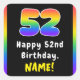 Este alegre y vibrante diseño de pegatina cuadrado de cumpleaños presenta el número "52" con un vibrante patrón de gradiente inspirado en el espectro arcoiris, junto con el mensaje "Feliz cumpleaños número 52", y un nombre de destinatario de personalizable. Pegatinas como estos podrían ser usados o entregados en una fiesta de cumpleaños realizada para alguien que está celebrando su cumpleaños número 52, o quizás usados cuando preparan invitaciones o regalos para un evento de este tipo. [~Z0000630]