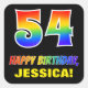 Este colorido, alegre y divertido diseño pegatina de cumpleaños presenta un gran número "54" y el mensaje "FELIZ CUMPLEAÑOS", ambos coloreados con un patrón inspirado en el gradiente del espectro del arcoiris, junto con un nombre personalizado amarillo en negrita. El fondo es negro de color. Pegatinas con temas de cumpleaños divertidos como este pueden ser usados cuando se envuelven un regalo o un regalo para celebrar el cumpleaños 54 de alguien, o tal vez se les puede dar a los asistentes en una celebración de cumpleaños. [~Z0000480]
