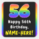 Este llamativo y divertido diseño de pegatina cuadrado con temática de cumpleaños presenta el número "56" con un patrón de gradiente inspirado en el espectro arcoiris multicolor, junto con el mensaje "Feliz cumpleaños número 56", y un nombre de destinatario personalizado. Pegatinas con temas de cumpleaños como estos pueden ser usados o distribuidos en un fiesta que celebra el cumpleaños 56 de alguien, o tal vez usados al preparar invitaciones o regalos para un evento de este tipo. [~Z0000630]