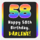 Este llamativo y optimista diseño de pegatina cuadrado con temática de cumpleaños presenta un gran número "58" con un patrón de gradiente inspirado en el espectro de colores arcoiris, junto con el mensaje "Feliz cumpleaños número 58", y un nombre de destinatario personalizado. Pegatinas alegres como estos podrían ser usados o distribuidos en una fiesta de cumpleaños realizada para alguien en celebración de su cumpleaños número 58, o quizás usados cuando preparaban invitaciones o regalos para un evento de este tipo. [~Z0000630]