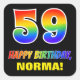 Este colorido, divertido y alegre diseño de pegatina temático de cumpleaños presenta un gran número "59" y el mensaje "FELIZ CUMPLEAÑOS", ambos con un colorante inspirado en el gradiente del espectro del arcoiris, junto con un nombre editable en negrita amarillo. El fondo es negro de color. Pegatinas divertidos esto podría ser usado cuando se envuelve un regalo o regalo en honor al cumpleaños 59 de alguien, o tal vez se lo entreguen a los asistentes en una celebración de cumpleaños. [~Z0000480]