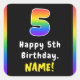 Este vibrante y alegre diseño de pegatina cuadrado con temática de cumpleaños presenta el número "5" que tiene un vibrante patrón de gradiente inspirado en el espectro de arcoiris multicolor, junto con el mensaje "Feliz quinto cumpleaños", y un nombre de destinatario personalizado. Pegatinas como estos podrían ser usados para celebrar el quinto cumpleaños de alguien. [~Z0000630]