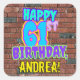 Este divertido diseño de pegatina cuadrado con temática de cumpleaños presenta el mensaje "FELIZ CUMPLEAÑOS 61", con una apariencia colorida, vibrante, inspirada en el graffiti y el arte urbano callejero, además de un nombre de destinatario personalizado. El fondo está decorado con un patrón inspirado en el aspecto de una pared de ladrillo. Pegatinas vibrantes, divertidos y personalizados como este pueden ser dados como regalo de cumpleaños, o usados al envolver regalos, o quizás usados como decoraciones de fiestas de cumpleaños cuando se celebra el cumpleaños 61 de alguien. [~Z0000535]