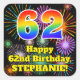 Este alegre y alegre diseño de pegatina cuadrado con temática de cumpleaños presenta un gran número "62" con un colorido patrón inspirado en el gradiente del espectro arcoiris. También incluye el mensaje "Feliz cumpleaños número 62", y un nombre personalizado. El fondo presenta un patrón colorido inspirado en fuegos artificiales de celebración. Pegatinas divertidos, coloridos y personalizados como este pueden ser dados como regalo de cumpleaños, o usados al envolver regalos, o quizás usados como decoración de fiesta de cumpleaños cuando se celebra el cumpleaños 62 de alguien. [~Z0000579]