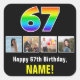 Este divertido y optimista diseño de pegatina cuadrado de cumpleaños presenta un gran número de "67" con un colorido patrón de gradiente inspirado en el espectro arcoiris, junto con el mensaje "Feliz cumpleaños número 67", y un nombre editable para el destinatario. También hay fotos que pueden ser personalizadas, tal vez con fotos del destinatario, la familia del destinatario y amigos, y/o el(los) remitente(s) de un regalo. Pegatinas como estos podrían ser usados para celebrar el 67 cumpleaños de alguien. (Fotografía © Storytree Studios, Stanford, CA.) [~Z0000670]