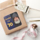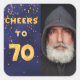 Un pegatina de moda en la fiesta de cumpleaños 70. Con el texto: Saludos a 70 en la parte delantera escrita con letras falsas de globo de oro. Fondo azul con confeti dorado. El color azul es desigual. Plantilla para tu foto.