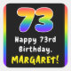 Este audaz y alegre diseño de pegatina cuadrado con temática de cumpleaños presenta un gran número de "73" con un vibrante patrón de gradiente inspirado en el espectro arcoiris, junto con el mensaje "Feliz 73 cumpleaños", y un nombre editable del destinatario. Pegatinas como estos podrían ser distribuidos o usados en un fiesta realizado en celebración de los setenta y tres años de alguien, o quizás usados al envolver regalos o preparar invitaciones para tal evento. [~Z0000630]