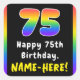Este animado y alegre diseño de pegatina cuadrado con temática de cumpleaños cuenta con un gran número de "75" con un vibrante patrón de gradiente inspirado en el espectro del arcoiris multicolor, junto con el mensaje "Feliz cumpleaños número 75", y un nombre de destinatario personalizado. Pegatinas con temas de cumpleaños que atraen la vista como estos podrían ser entregados o usados en un fiesta que celebra el cumpleaños 75 de alguien, o quizás usados al preparar regalos o invitaciones para un evento de este tipo. [~Z0000630]