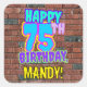 Este divertido diseño de pegatina cuadrado con temática de cumpleaños presenta el mensaje "FELIZ CUMPLEAÑOS 75″, con un colorido, vibrante, graffiti y arte urbano inspirado en el arte callejero, además de un nombre de destinatario personalizado. El fondo está decorado con un patrón inspirado en el aspecto de una pared de ladrillo. Pegatinas vibrantes, divertidos y personalizados como este pueden ser dados como regalo de cumpleaños, o usados al envolver regalos, o quizás usados como decoraciones de fiestas de cumpleaños cuando se celebra el cumpleaños 75 de alguien. [~Z0000535]