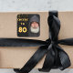 Un pegatina de moda en la fiesta de cumpleaños número 80. Con el texto: Saludos a los 80 en la parte delantera escrita con letras falsas de globo de oro. Fondo negro con confeti dorado. Plantilla para tu foto.
