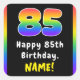 Este divertido y alegre diseño de pegatina cuadrado con temática de cumpleaños incluye el número "85", que tiene un vibrante patrón de gradiente inspirado en el espectro de arcoiris multicolor, junto con el mensaje "Feliz cumpleaños número 85", y un nombre de destinatario personalizado. Pegatinas como estos podrían ser usados o distribuidos en un fiesta realizado en celebración del 85 cumpleaños de alguien, o tal vez usados al preparar invitaciones o regalos para un evento de este tipo. [~Z0000630]