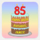 Este animado y colorido diseño de pegatina cuadrado con temática de cumpleaños presenta una representación al estilo personalizado de una torta de cumpleaños de tres niveles con velas en forma de numeral en la parte superior que muestran el número "85", junto con el mensaje "FELIZ CUMPLEAÑOS 85", y un nombre de destinatario personalizado. El fondo tiene un patrón multicolor de gradiente inspirado en el espectro arcoiris pastel. Pegatinas como estos podrían ser usados para celebrar el 85 cumpleaños de alguien. [~Z0000624]