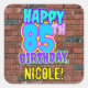 Este divertido diseño de pegatina cuadrado de cumpleaños incluye el mensaje "FELIZ CUMPLEAÑOS 85", con un colorido, vibrante, arte urbano e inspirado en el graffiti, además de un nombre de destinatario del personalizable. El fondo está decorado con un patrón inspirado en el aspecto de una pared de ladrillo. Pegatinas vibrantes, divertidos y personalizados como este pueden ser dados como regalo de cumpleaños, o usados al envolver regalos, o quizás usados como decoraciones de fiestas de cumpleaños cuando se celebra el cumpleaños 85 de alguien. [~Z0000535]