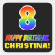 Este colorido, alegre y divertido diseño de pegatina con temática de cumpleaños presenta un gran número "8" y el mensaje "FELIZ CUMPLEAÑOS", ambos coloreados con un patrón inspirado en el gradiente del espectro arcoiris, junto con un nombre personalizado amarillo en negrita. El fondo es negro de color. Este tipo de pegatinas con temas de cumpleaños divertidos podrían ser usados cuando se envuelve un regalo o un regalo para celebrar el octavo cumpleaños de alguien, o tal vez se los entregue a los invitados en una fiesta de cumpleaños. [~Z0000480]
