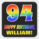 Este alegre, divertido y colorido diseño de pegatina con temática de cumpleaños presenta un gran número "94" y el mensaje "FELIZ CUMPLEAÑOS", ambos coloreados con un patrón inspirado en el gradiente del espectro del arcoiris, junto con un nombre en negrita de personalizable amarillo. El fondo es negro de color. Pegatinas divertidos como este podrían ser usados cuando se le dan regalos a alguien en celebración de su cumpleaños 94, o tal vez se los entreguen a los asistentes en una celebración de cumpleaños. [~Z0000480]