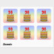 This joyful and colorful birthday square sticker design features a cartoon-style depiction of a three-tier birthday cake having numeral-shaped candles on top showing the number “98“, along with the message “HAPPY 98TH BIRTHDAY,”, and a custom recipient name. The background features a multicolored pastel rainbow spectrum inspired gradient pattern. Cheerful birthday themed stickers like these might be used or distributed at a birthday party in celebration of somebody’s 98th birthday, or perhaps used when preparing invitations or wrapping gifts for such an event. [~Z0000624]