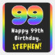 Este audaz y alegre diseño de pegatina cuadrado de cumpleaños presenta un gran número "99" que tiene un patrón de gradiente inspirado en el espectro multicolor de arcoiris, junto con el mensaje "Feliz cumpleaños 99", y un nombre de destinatario editable. Pegatinas con temas de cumpleaños como estos pueden ser usados o entregados en un fiesta que celebra el 99º cumpleaños de alguien, o tal vez usados al envolver regalos o preparar invitaciones para tal evento. [~Z0000630]