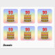 This upbeat and cheerful birthday square sticker design features a cartoon-style depiction of a three-tier birthday cake having number-shaped candles on top showing the age “99“, along with the message “HAPPY 99TH BIRTHDAY,”, and a personalized recipient name. The background has a multi-color pastel rainbow spectrum inspired gradient pattern. Fun birthday themed stickers like these might be used or distributed at a party for somebody who is celebrating their ninety ninth birthday, or perhaps used when preparing invitations or wrapping presents for such an event. [~Z0000624]