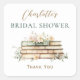 Elegant "A new chapter" bridal shower favor sticker features a stack of beautiful vintage hardcover books adorned with pastel pink and blush flowers. Personalize the golden bronze and rich green text with the bride's name and a custom thank you message.
