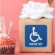 Signo de accesibilidad. Símbolo de silla de ruedas. Persona blanca estilizada en silla de ruedas. Fondo azul. Texto personalizado.
