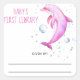 Una pequeña invitación a bañarse bajo la temática del mar, con un delfín rosado de suave color azul. Burbujas acuáticas.
