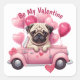 El adorable perro de cerdo en estos pegatinas de sello para sobres monta en un auto rosa con globos de corazón rosados flotando a su alrededor. El texto rosa más oscuro de la parte superior dice "Sé mi Valentín". Todo está colocado sobre un fondo blanco. ¡Colorido y lindo!
