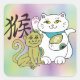Un sonriente Gato Maneki Neko Lucky está acompañado por una mascota de monos en este diseño temático del Año Zodiaco Chino del Mono. El gato tiene un símbolo de buena suerte y el símbolo kanji para el mono aparece encima del mono. El trabajo artístico es un diseño original de Three Cats Graphics. El mono es la novena señal del zodiaco chino. Colores afortunados: blanco, dorado y azul; Flores suertudas: crisantemo, alio; Año de nacimiento: 1920, 1932, 1944, 1956, 1968, 1980, 1992, 2004, 20 16, 2028; Números de Suerte: 1, 7, 8.