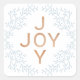 Diseño pegatina vacacional sencillo y elegante con "JOY" escrito en grandes letras en negrita sobre fondo blanco con polvorientos elementos botánicos azules.