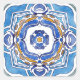 Un diseño ornamental azul, amarillo y verde sobre un fondo blanco como se ve en las baldosas mediterráneas