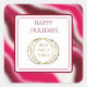Añada el logotipo de su negocio a este pegatina de rayas rojas y rosas festivas y blancas. "Felices Fiestas" escrito en la moderna y elegante tipografía es editable. Las rayas texturadas de caña de caramelo son mi diseño original. Tomé los colores vibrantes de una fotografía original de una flor peony. El patrón de caramelos de vacaciones de los Navidades y el brillo rodean el texto simple y moderno sobre fondo blanco. Personalice esta etiqueta o pegatina para sus regalos promocionales de negocios, sobres de vacaciones de negocios y tienda de vacaciones que envuelve esta temporada de vacaciones de Navidades.