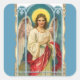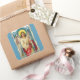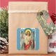 pintura vintage de un ángel con una gran cinta roja, encantadora espuma blanca con adornos dorados y manos juntas en oración