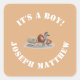 El diseño de Animales Cute Stuffed presenta un fondo de color canela de la frase de personalizable "¡Es un niño!" con letras blancas. También en las letras blancas está el nombre del bebé. El centro de diseño presenta una imagen de animales adorables y cariñosos todos apiñados listos para dar la bienvenida a un bebé. Todo el texto es personalizable.
