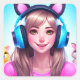 Un lindo chica de anime con orejas de gato y auriculares para juegos o música.