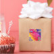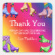 cumpleaños de patinaje de rodillos retro de colores brillantes 'gracias por venir a mi fiesta' pegatina con un fondo de color arcoiris audaz y patines y pesas multicolores.