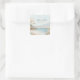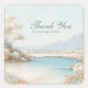 Express your appreciation with this exquisite aqua lake pastel landscape sticker, capturing a scene of profound serenity. The design showcases a beautiful watercolor vista of clear, still water reflecting a soft peach beige sky and distant, hazy mountain ranges. The foreground features a detailed, rocky shoreline adorned with bursts of coral and white wildflowers and a striking white flowering tree, lending a charming, naturalistic feel. This tranquil artwork is beautifully framed by a thin, elegant gold geometric line, perfectly enhancing the scene's romantic and dreamlike quality. Use this unique sticker to add a peaceful and polished seal to your correspondence. This sticker is perfect for: Coastal resorts or beachfront event planners, Destination wedding stationery, Luxury jewelry brands packaging light-toned pieces, and Watercolor art studios sealing packages. This versatile sticker adds a touch of sophistication to any business, event, or special occasion.