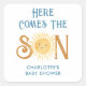 El pegatina de esta ducha de bebé de un niño adorable muestra el texto "Here Comes The Son" en una tipografía retro azul con un sol de color amarillo sonriente. Personalizable fácil. Acuarela original © Michele Davies.