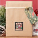 "Feliz Navidad" estilo retro de los años 70 con Santa Claus y feliz árbol de Navidad, ¡además de regalos! Fondo negro con fondo de contrapeso y borde de nevado. Este diseño se adapta a los años 70. Ideal para paquetes de correo o regalos.