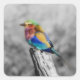 Hermosa ave de color arcoiris encaramada en un trozo. El fondo blanco y negro contrasta con las plumas de colores.
