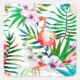 Una obra de arte tropical con flamencos rosas y plantas verdes de selva tropical con flores de hibisco y palmeras sobre un fondo blanco neutro. Una divertida y colorida obra de arte.