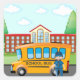 Un autobús escolar y su chofer afuera de una escuela. Este diseño parece realmente efectivo para estos Pegatinas