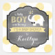 Impresión de puntos amarillos y blancos con marco de pizarra y elefante blanco con etiqueta de regalo de ducha de bebé con corbata de arco.