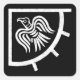 Un ilustracion blanco y negro de la bandera del Raven que ondeaba guerreros y chozas.